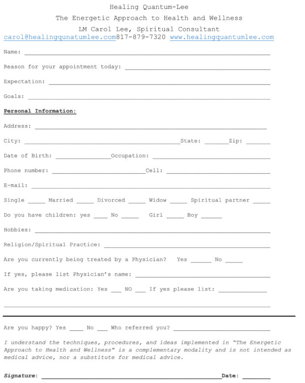 The first session is all encompassing; you will fill out a Client Intake form, (via email) discuss your current life situation and health issues in order for Carol to provide you with tools, techniques and skills to assist in accomplishing your goals. She receives information for your very Highest and Best and will act with integrity, discernment and for the Greater Good of Mankind, to the best of her understanding.